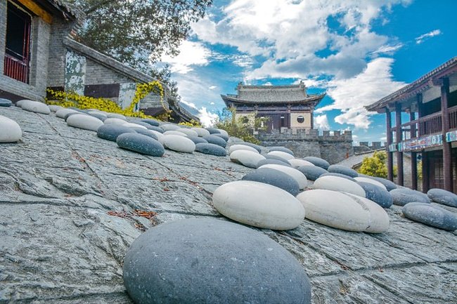 从洗马潭乘缆车至山脚,一路台阶,一路苔藓,一路古树,一路草香,一路寻去,雍容典雅的影视城就掩映在叠翠幽岚之中。此时,漫步于天龙八部影视城内,仿佛穿越时空,回到金庸笔下《天龙八部》中的武侠江湖,去寻找侠骨柔情与天地自由。浓云厚雾下的点苍山显得雄伟苍茫,映衬着坐落其中的影视城,影视城变得更加空灵寂静。