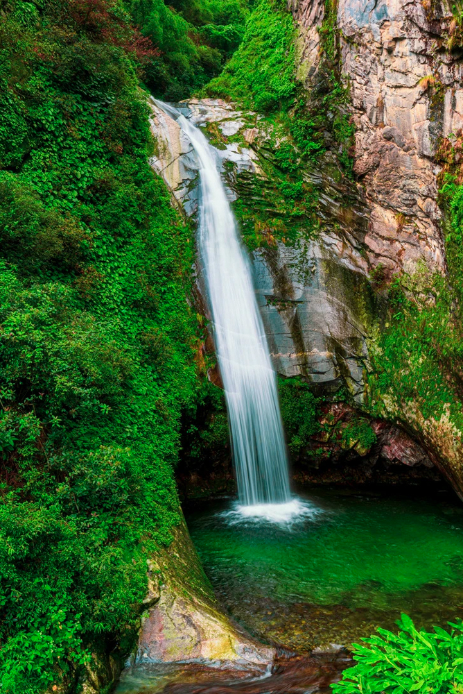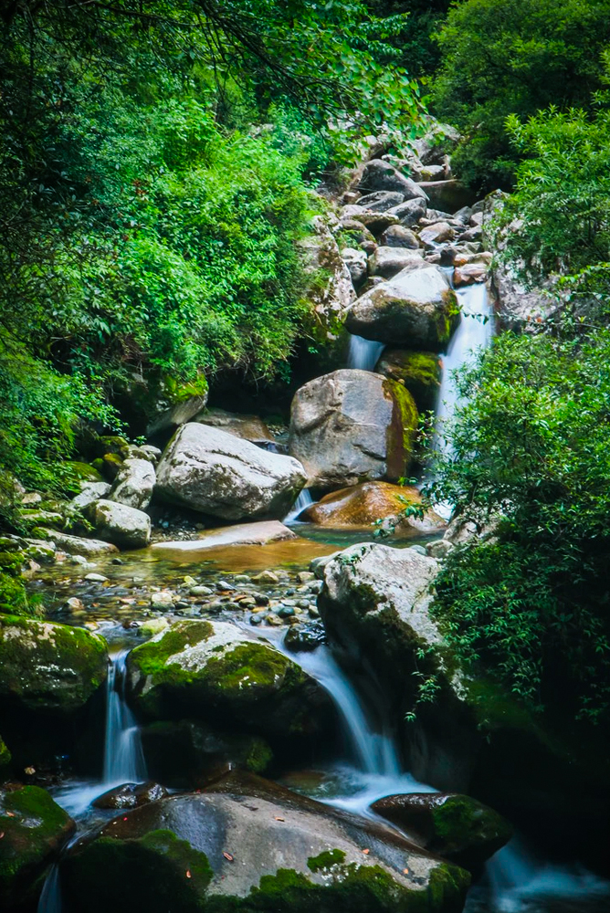 行至苍山半山腰,下了索道,青石台阶连接处便是七龙女池,这是一方水的世界,一帘幽梦的水晶垂帘云雾缭绕,瀑布与潭水岩石相击,水声轰鸣摄人心魄,冲出一个个深浅不一、大小各异的水潭,那池水高低分明、错落有致,而且一潭比一潭小,一潭比一潭清丽无比,一道激流串起七个晶莹的池塘,像一串串晶莹的玉翠,绵延数公里不绝。